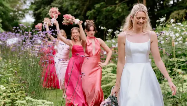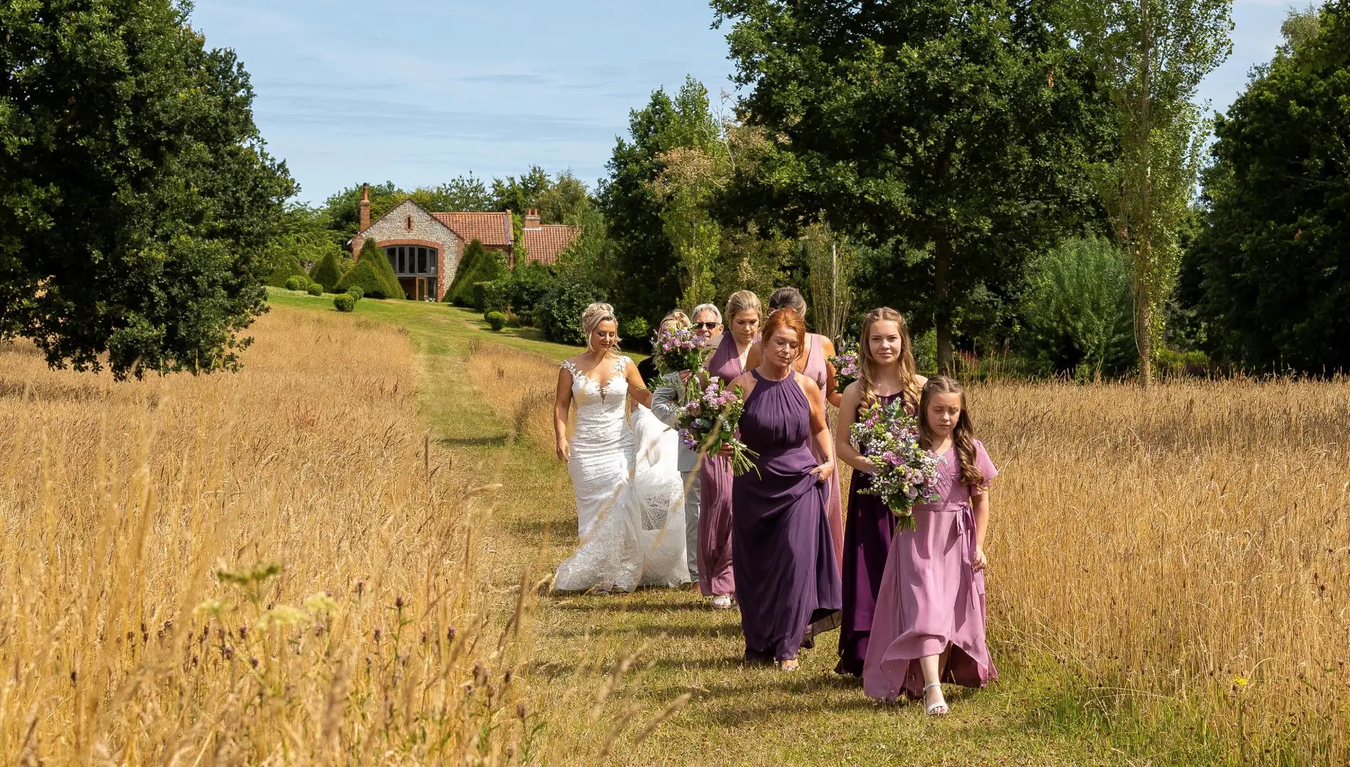 After processing through the long grass and wildflowers of the valley, you and your bridesmaids will enter through a tunnel of wisteria into a secret and secluded woodland grove. In the bosom of nature, surrounded by towering trees, you will say your vows in front of a living willow tunnel covered in climbing flowers.